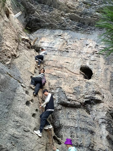 在“野人洞”旁的石壁上,老师与同学们对攀岩跃跃欲试,攀登山顶的脚力,生于欲穷千里目的壮心和不到长城非好汉的意志,展现了地科人的冒险与挑战精神。希望同学们在未来的学习中也能保持着这种挑战精神。