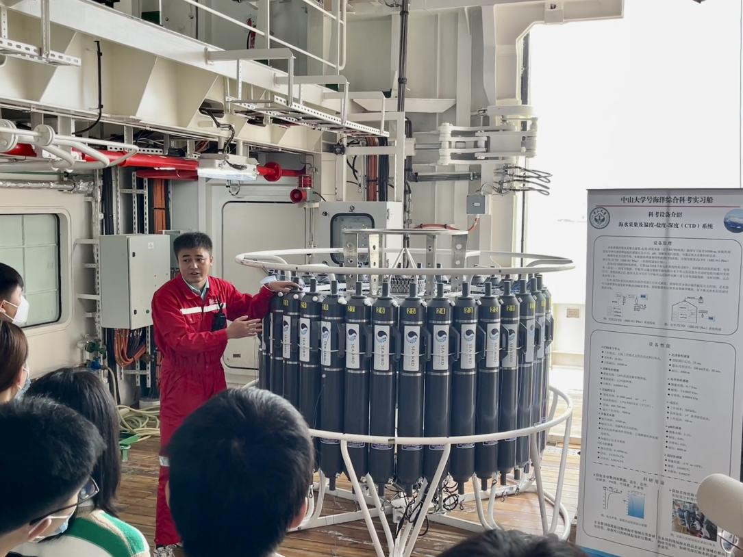 报告结束后,由金船长和大副带领同学们先后参观了科考船实验区域、作业区域、休闲生活区域、驾驶区域等,深入了解体验科考人员及船员的海上工作模式。期间,探测部赵旭老师向学生们介绍了船上配备的先进科考仪器、科考操作支撑和探测设备、样品处理、检测分析和数据处理的各类实验室,了解了船舶平台的综合性能和科考功能。赵旭老师还针对海上作业的主要设备,海水采集及温度—盐度—深度(CTD)系统、箱试取样器、长柱状活塞取样器、多波束海底地形测量系统、海底动态重力系统等,进行了较为详细的介绍,让同学们深入地进行了实地学习。
