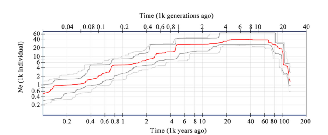 图4 基于RAD-seq数据对过去20万年以来丹霞梧桐有效群体大小变化的推断