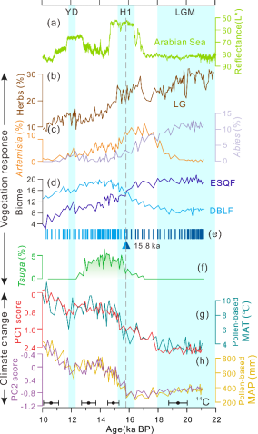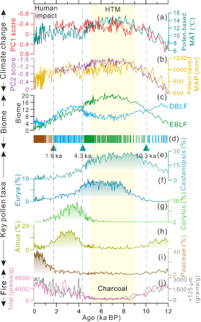 中山大学地球科学与工程学院的张潇、黄康有、郑卓等与国内外多家科研机构合作,利用贵州省草海湿地21 ka以来连续且高分辨率的孢粉/碳屑记录,定量重建了LGM以来的植被群落演替(Biome)和气候变化过程。结果表明,LGM阶段,研究区主要植被类型为常绿硬叶栎林(ESQF),云杉/冷杉等高山针叶类植物及蓼属等耐寒草本植物比例相对较高。LGM向全新世过渡期间(约15.8 ka),植被类型由ESQF转变为落叶阔叶林(DBLF),主要种属包括落叶栎及桦木属等。在早全新世时期,常绿类植物花粉比例快速增加,如柯/栲属、大戟科、杨梅属、冬青属及野桐属等,DBLF在10.3 ka左右演替为以柯/栲属为建群植物的常绿阔叶林(EBLF)。常绿阔叶类种属的花粉比例在9-5 ka达到峰值,与全新世暖期(HTM)基本一致。此后,在晚全新世4 ka之后出现了落叶类植物(桤木属等)再次增加的情况,替代了常绿阔叶林。值得注意的是,禾本科及松属等花粉比例在2 ka以来达到峰值,表明人类活动对当地植被的影响在该时段显著增加(图1)。