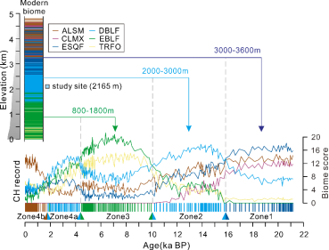 基于花粉数据进行的Biome重建结果清晰的表明了植被带的垂直迁移特征,通过与现代植被类型的分布范围相对比,在末次盛冰期和全新世之间存在大约1000米左右的最大垂直迁移量。对花粉数据的统计结果表明主成分分析可以作为可靠的气候变化指标,与TraCE模型的气候模拟结果相一致。此外,无论是花粉记录还是模型结果均表明森林生态系统在温度和湿度条件超过植物气候阈值时会发生转型,强调了气候界限在驱动生物群系演替中起到的关键作用。