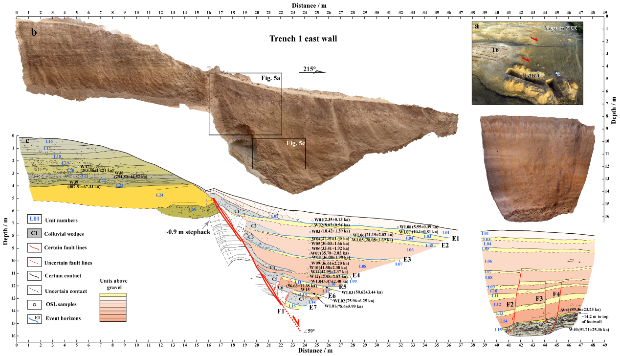 最近,中山大学与天津大学、中国地震局地质研究所、长安大学等单位的联合研究团队,通过大型古地震探槽揭露和精细的研究,揭示了该断裂带东段在过去5万年以来的大地震事件和发生规律,成果发表于地学期刊《Tectonophysics》上。