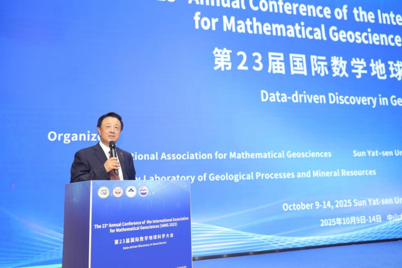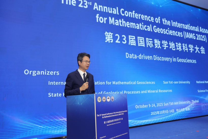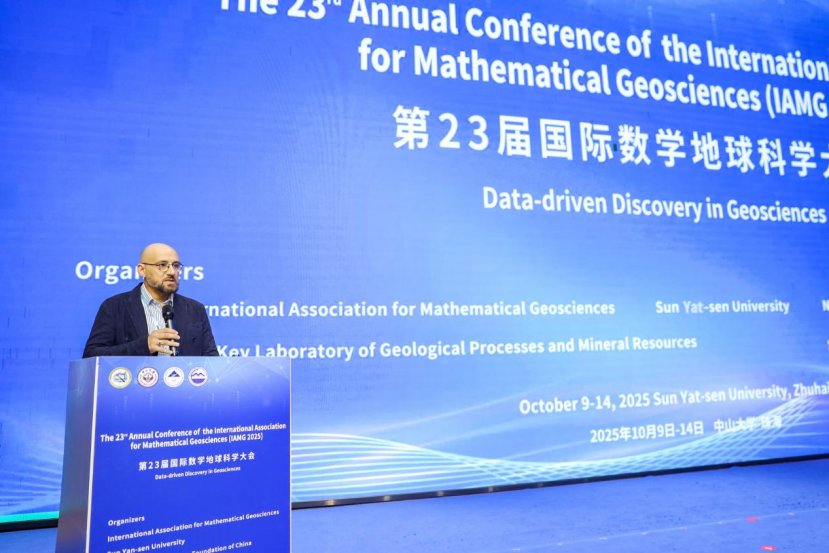 2025年10月9日至14日,第23届国际数学地球科学大会(IAMG2025)在广东省珠海市中山大学珠海校区隆重举行。这是该盛会时隔18年再次回到中国举办,彰显了中国在地球科学领域的国际影响力。大会主席成秋明院士主持大会开幕式(图1),中山大学副校长林天歆教授代表承办单位致欢迎辞(图2),国际数学地球科学协会(IAMG)主席R. Tolosana Delgado博士代表国际数学地球科学协会致辞(图3)。