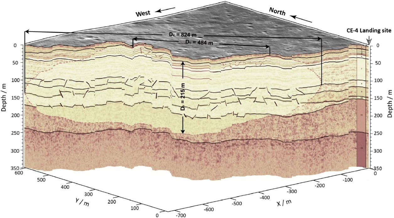 探月雷达结果显示,在着陆区下方,掩埋着一个完整的古老埋藏撞击坑。该撞击坑直径达484米,其引发的地下结构特征延伸至215米深处。通过综合分析,研究团队还构建了一个包含12层的地层结构(图3),揭示了由月壤、古月壤层、溅射沉积和玄武岩单元构成的复杂地质序列。更重要的是,这些雷达图像首次提供了撞击坑地下改造过程的原位证据,清晰识别出典型的撞击坑地下特征,包括:改造区、放射状坍塌、中央回弹和深部断裂系统(图2b)。在此基础上,还根据雷达数据的空间分布,重建了该撞击坑的三维结构(图4)。