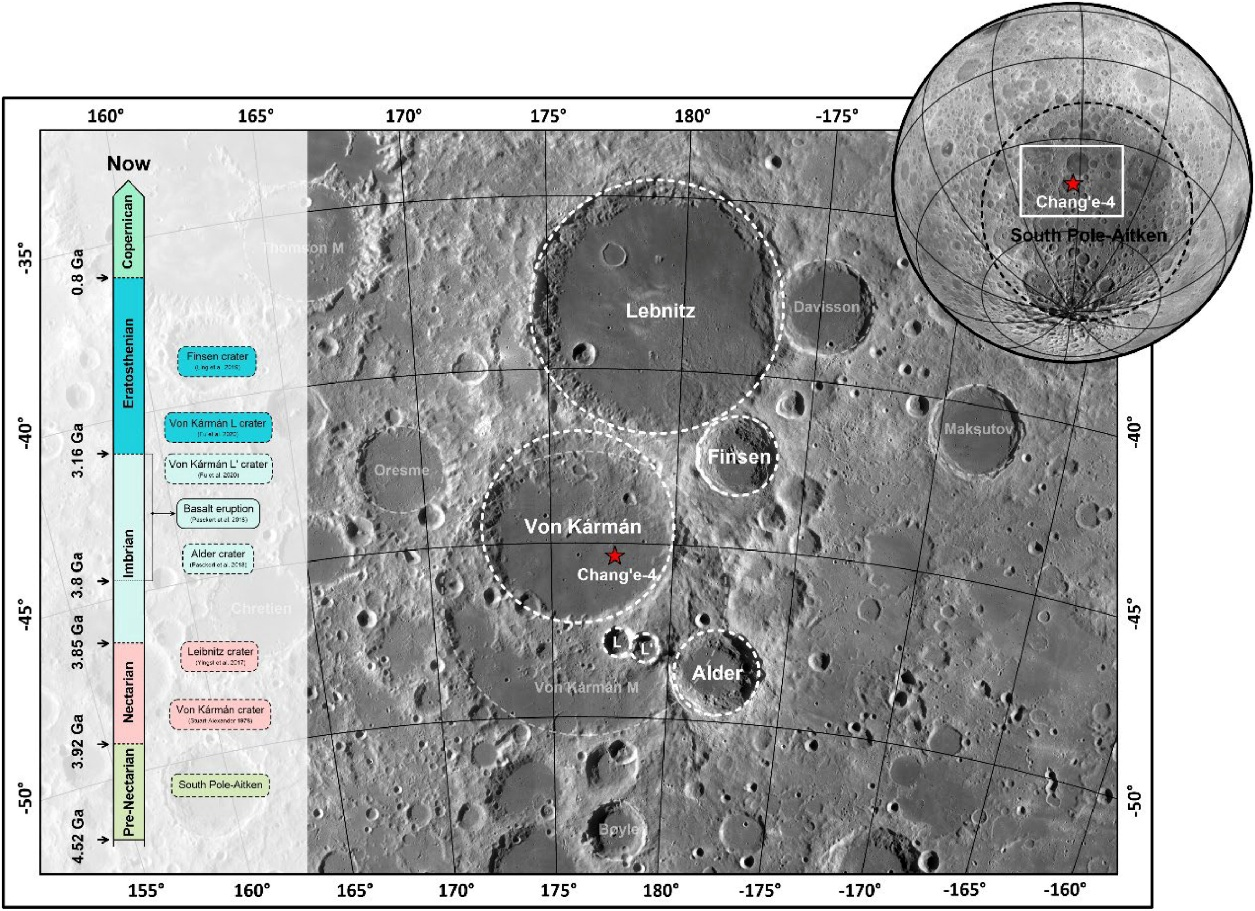 撞击坑是月球表面最普遍、最显著的地质特征,它们是太阳系早期剧烈碰撞历史的忠实记录者。长期以来,对月球撞击坑的研究多依赖于表面形貌分析和数值模拟,但对于撞击事件如何在月表之下改造岩层,一直缺乏直接的观测证据。嫦娥四号任务的着陆区位于月球背面南极-艾特肯盆地内的冯·卡门撞击坑(图1),为深入研究月球的早期地质历史和撞击内部响应结果提供了绝佳的条件。