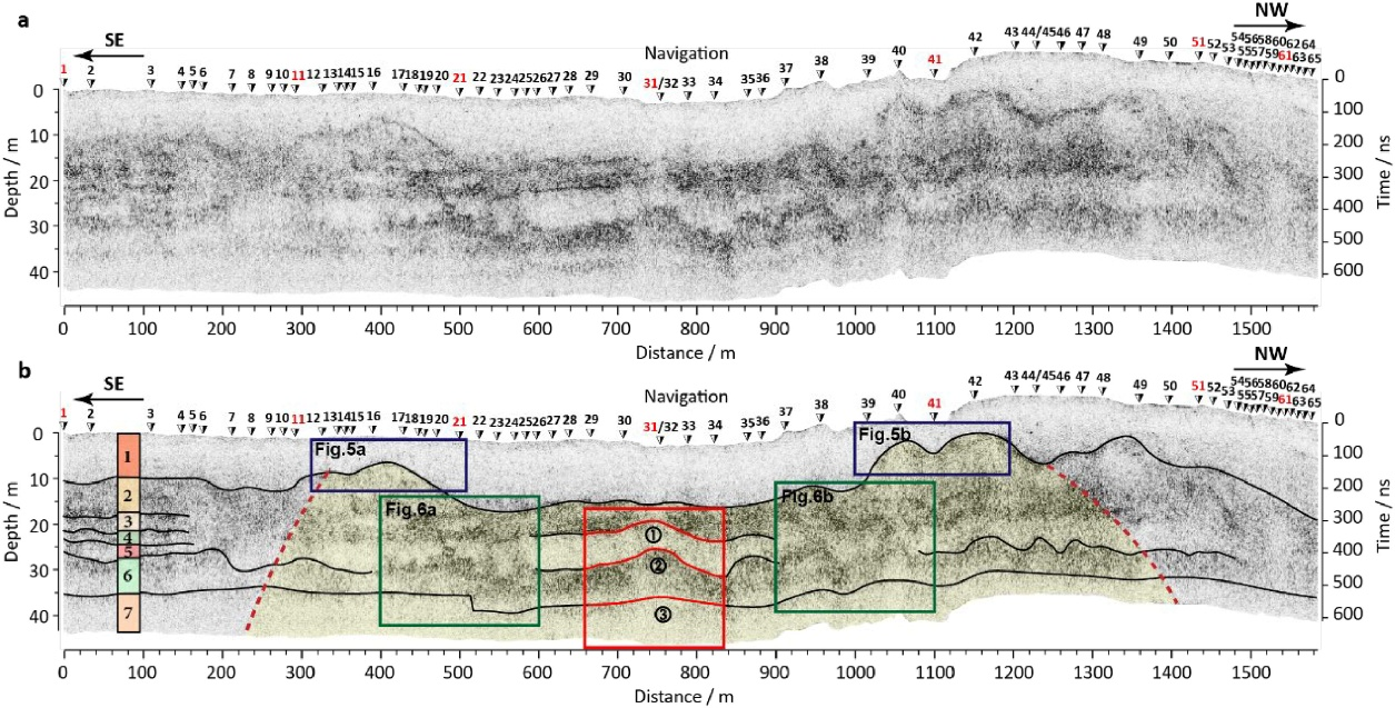 为深入剖析月球撞击事件,我院张领副教授及其合作研究团队利用中国嫦娥四号任务“玉兔二号”月球车搭载的探月雷达,对长达65个月球日、总计约1600米的巡视路径所采集的数据进行了综合分析。利用其高、低频双通道,实现了从浅到深、清晰连贯的地下结构成像(图2、图3)。