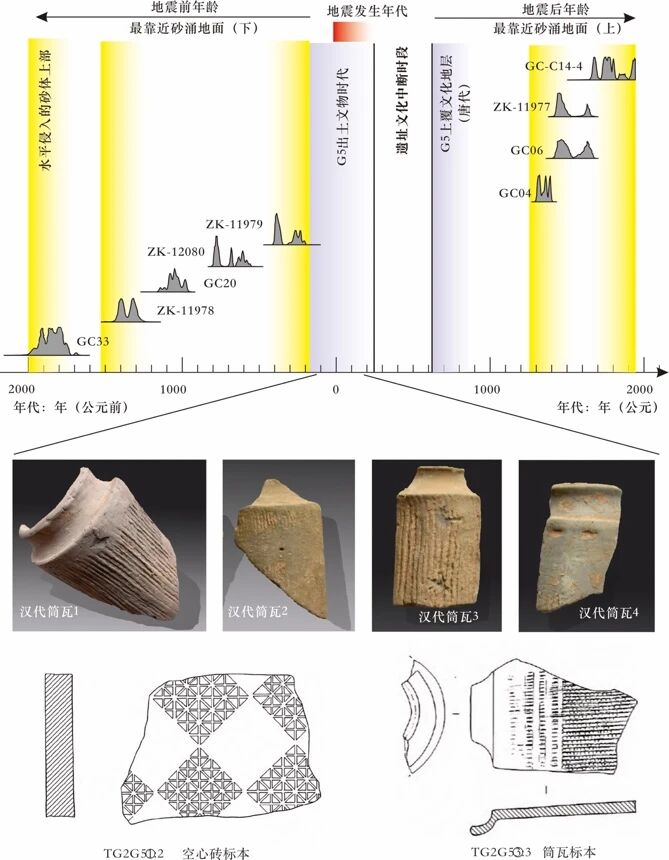 固城遗址位于郑州市惠济区固城村一带,北距黄河约6.6km,东南毗邻贾鲁河。其文化层包括东周-汉代(姜楠等,2023)。在汉代文化层中识别出NNE和NEE走向、相交的液化脉,长30~50m,一般宽2~10cm,局部达20cm。液化砂土为质地纯净的疏松粉砂。局地可见倒锥形的喷砂口,上覆涌出的液化砂土。同时,在液化砂土侵入的地层内局部可见水平侵入砂体。地震时代标志性遗物包括空心砖TG2G5①∶2(图2),泥质灰陶。表面印有菱形米格纹,内壁粗糙,在汉代郑洛地区较为流行。筒瓦TG2G5③∶3,表面印有细直绳纹,拍印较浅,瓦唇薄、短而较卷曲,接近汉河南县城遗址出土的Ⅱ式瓦当(中国社会科学院考古研究所,1989),年代在西汉晚期至东汉初期。表明固城遗址的地震年代为202BC—220AD(西汉—东汉之间)。