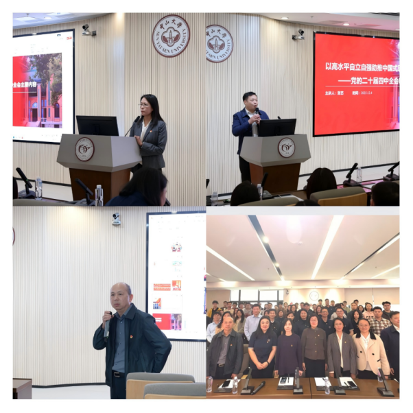 孔晓慧书记在党建活动中致辞。金卓行老师列席并发言。中山大学马克思主义学院张艺助理教授主讲题为“以高水平自立自强助推中国式现代化——党的二十届四中全会精神解读”的党课。