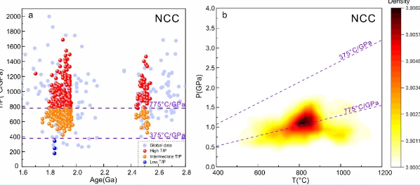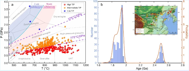 新太古代–古元古代是地球历史上最具变革性的时期之一,学界普遍认为全球动力学体制可能在这一时期发生了重大变化。我院尹常青教授团队的硕士研究生韩香巧(2025年7月毕业,现就职于山东省地质科学研究院)在其导师钱加慧副教授的指导下,与尹常青教授、香港大学张健教授和中国科学技术大学高彭研究员合作,通过整合华北克拉通新太古代–古元古代变质作用峰期阶段的温度(T)、压力(P)和T/P比值,以及P–T–t轨迹和变质年龄(t)等资料,建立了华北克拉通首个前寒武纪变质作用数据库,用以探讨华北克拉通新太古代–古元古代期间的变质热演化特征和构造体制演变(图1)。建模结果与全球数据(Brown et al., 2024)的对比表明: