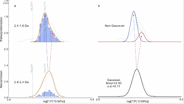 变质岩中的矿物组合对温度(T)和压力(P)条件非常敏感,可以反映特定构造环境下的瞬时地热状态(T/P比值),并记录温度和压力随时间(t)的动态变化过程(P–T–t轨迹)(England and Thompson, 1984)。开展变质岩的T、P、T/P比值、P–T–t轨迹形态与地质年代学数据的综合建模分析,可以有效反演地壳的热演化历史和地球动力学过程(Brown and Johnson, 2019),为揭示地球的早期演化提供新的视角。