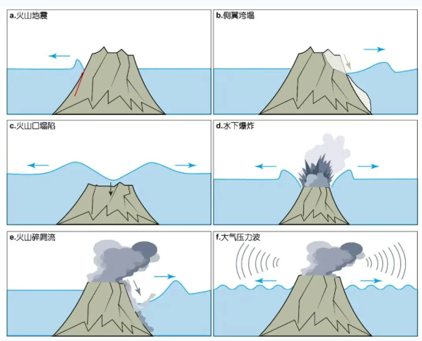 火山海啸是全球海洋灾害体系中极具破坏性、但长期被低估的灾害类型。与构造地震触发的海啸相比,火山海啸的触发机制更加复杂,往往由火山构造地震、火山口塌陷、火山碎屑流入海、火山侧翼垮塌、水下爆炸及大气压力波等多种机制共同作用(图1)。近年来,2018 年印尼喀拉喀托火山侧翼垮塌和 2022 年汤加洪加火山超强爆发相继触发区域海啸乃至全球海面扰动,使火山海啸受到国际高度关注,同时也暴露出当前灾害监测、评估与预警体系在应对火山海啸时存在明显不足。