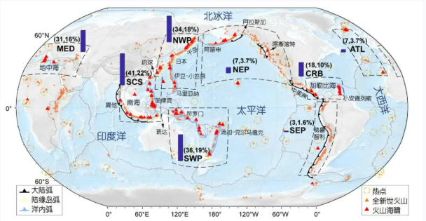 研究通过整合全球历史海啸事件、全球火山计划(GVP)等数据库及相关文献系统梳理了全球历史火山海啸事件,结果显示全球目前187 起历史火山海啸事件高度集中在环南海、西南太平洋、西北太平洋与地中海等板块活动强烈的区域(图2)。这些地区同时毗邻人口密集的沿海城市和重要海上通道,显示出明显的海洋环境与人类活动的高风险耦合特征。