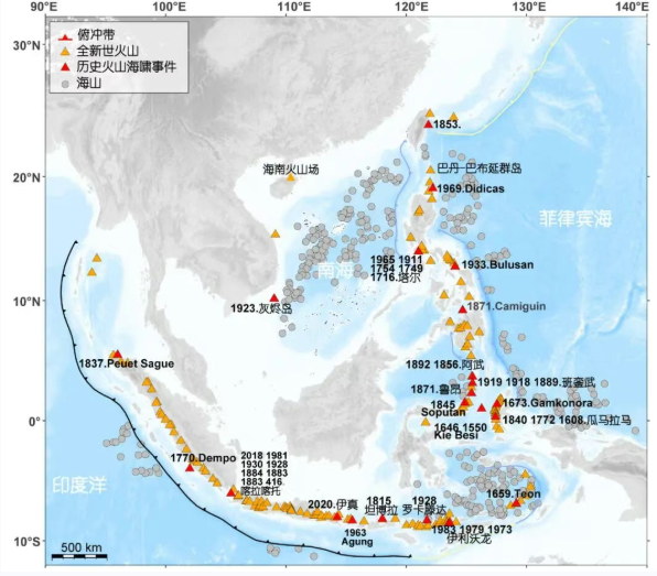 图 3  南海及其周缘区域历史火山海啸事件和潜在火山海啸源
