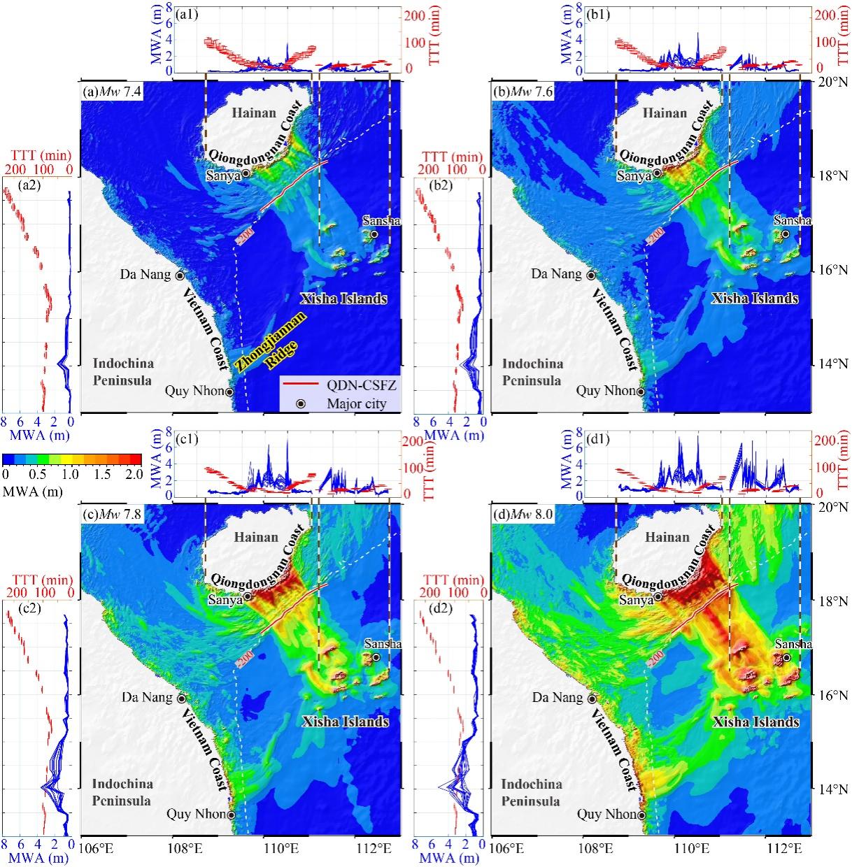 研究采用Zeng et al.2024基于最新地球物理数据约束的陆坡断裂带琼东南段断层参数,构建了280个不同震源机制的地震情景(Mw6.6~8.0),并引入随机震源模型以考虑地震破裂的非均匀性(图2)。基于COMCOT数值模型对海啸生成与传播过程进行模拟,结果表明,海啸波传播受区域海底地形控制,导致波能主要沿垂直断层走向的方向传播,并快速穿越琼东南深海盆地抵达西沙群岛,而在向北部湾和广东海岸传播时,由于经过浅水大陆架,到时显著延迟(图3。该断裂带发生Mw7.4以上地震可产生具有区域影响的海啸。在极端Mw8.0情景下,琼东南沿岸的最大海啸波幅可超过7 m,西沙群岛超过6 m。受中建南海岭影响,越南海岸也面临超过5 m的海啸威胁(4)。
