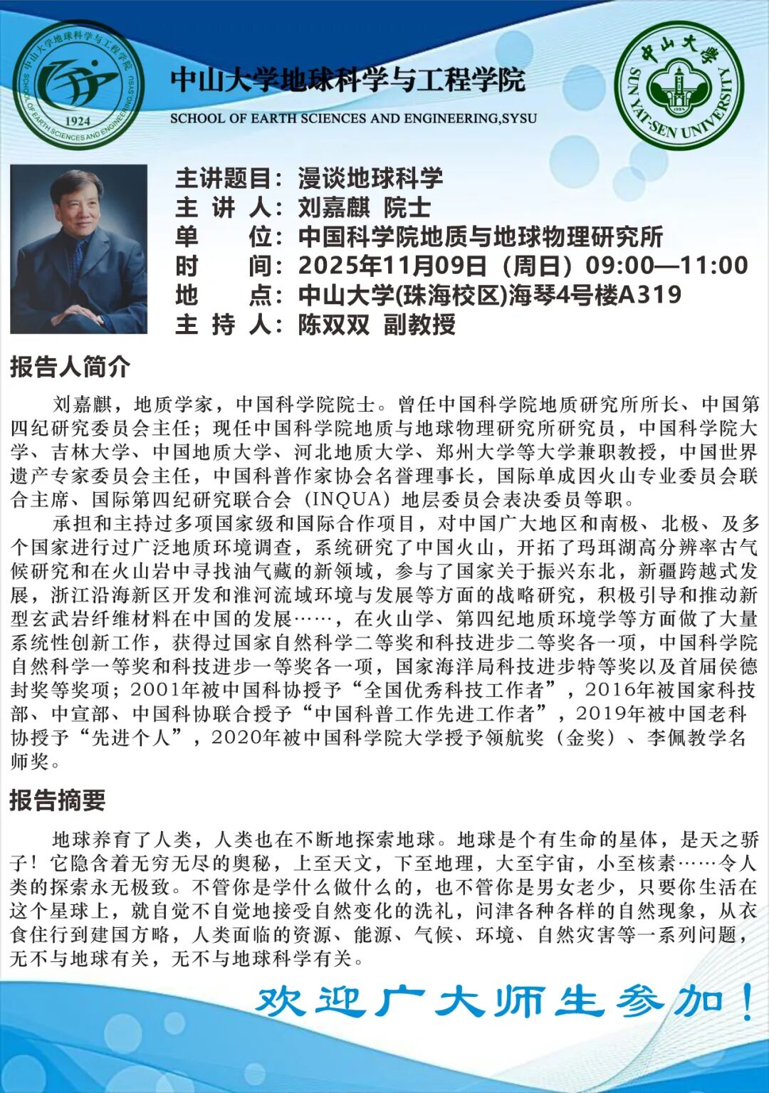 导航痕迹 首页 科学研究 学术交流与合作 讲座预告 | 名师讲座第345讲 讲座预告 | 名师讲座第345讲 漫谈地球科学 主讲人 刘嘉麒 院士 主持人 陈双双 副教授 活动地址 海琴四号A319 活动时间 2025年11月09日 09:00 - 2025年11月09日 11:00